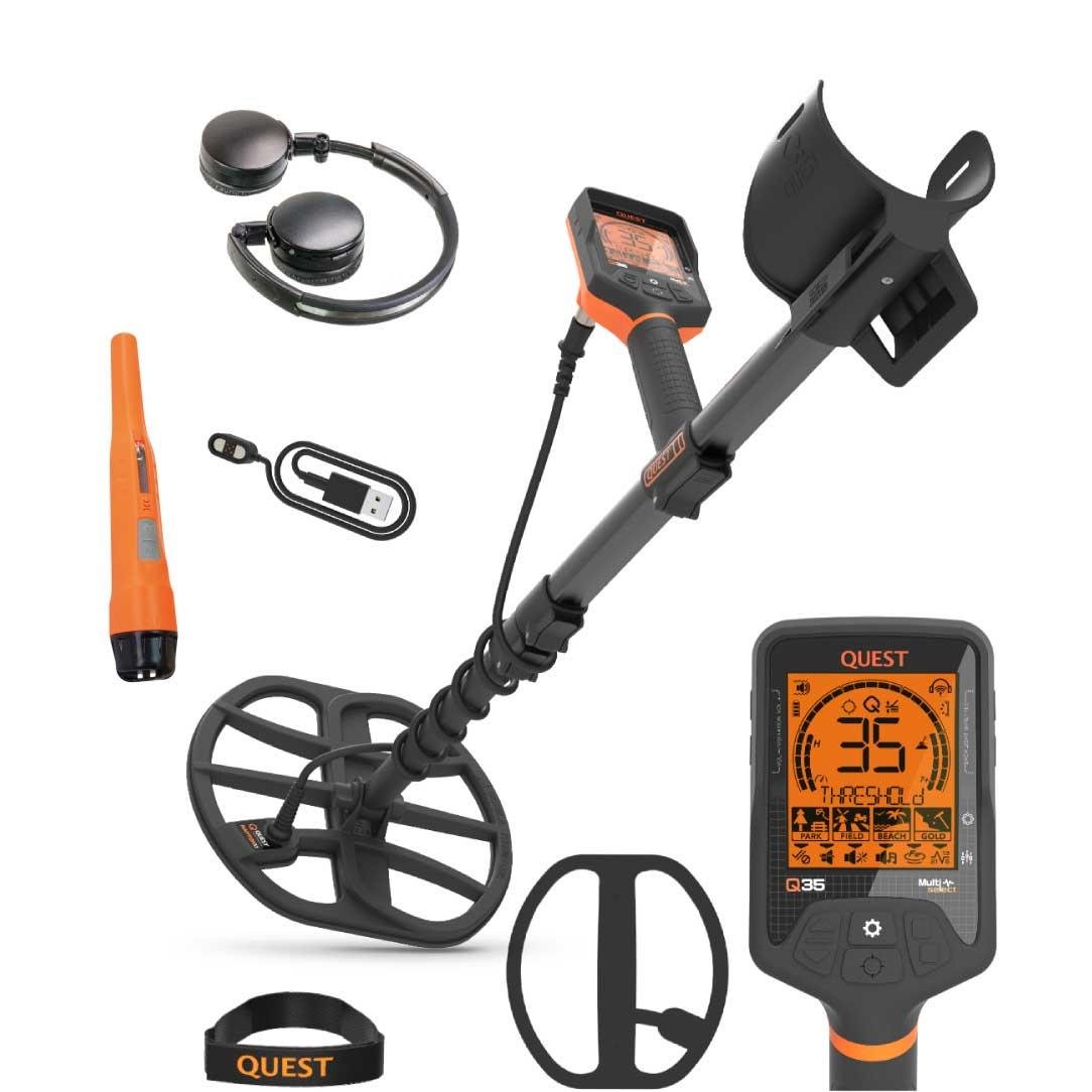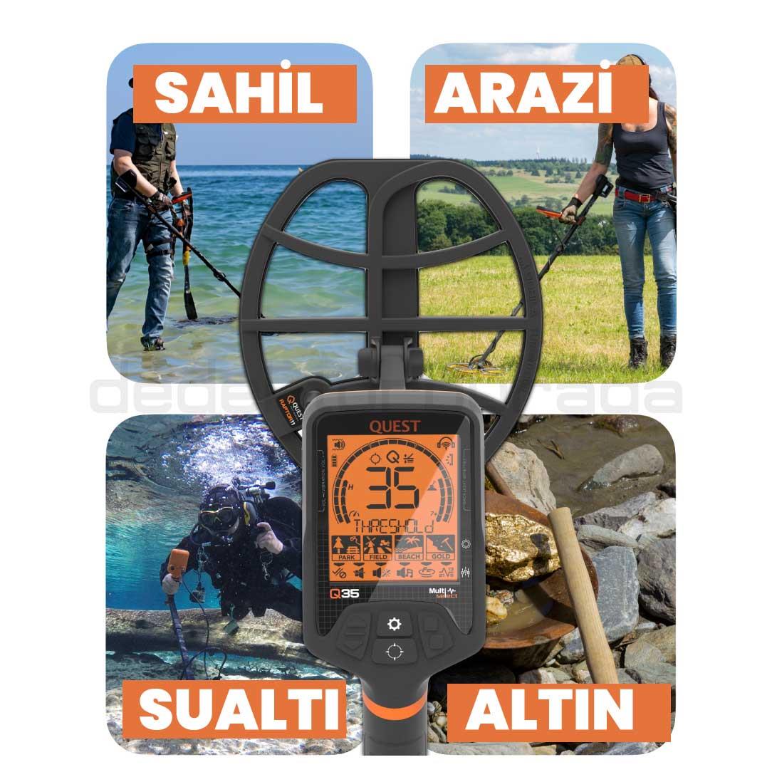 Quest Q35 dedektör, gelişmiş teknoloji ile donatılmış olup, olağanüstü hassasiyet ve doğruluk sunarak hiçbir değerli nesnenin gözden kaçmasına izin vermez.